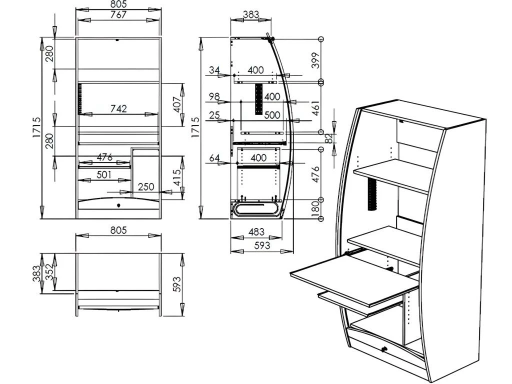 – Tablette coulissante pour clavier (autobloquante pour se transformer en plan de travail). Largeur 74,2 cm x Profondeur 50 cm