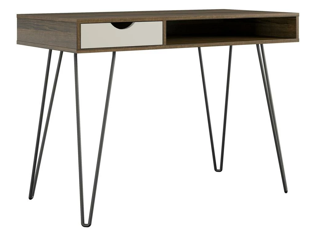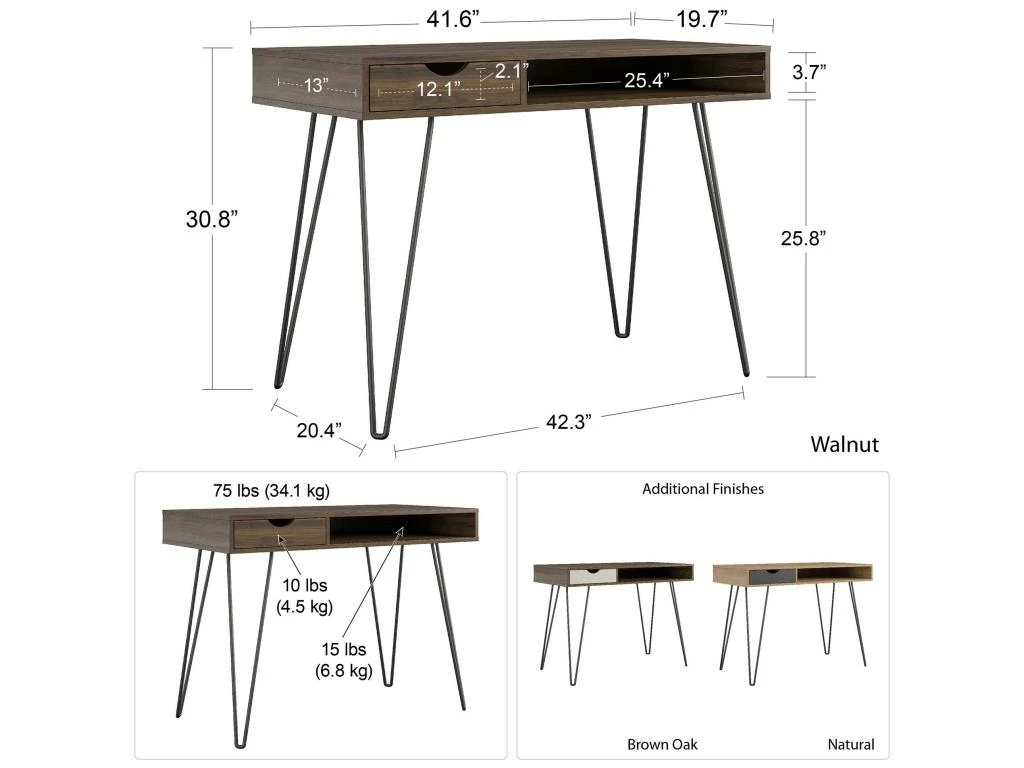 Fabriqué en panneau de particules laminé, la finition classique se marie avec les pieds en métal en forme d’épingle pour un aspect rétro.