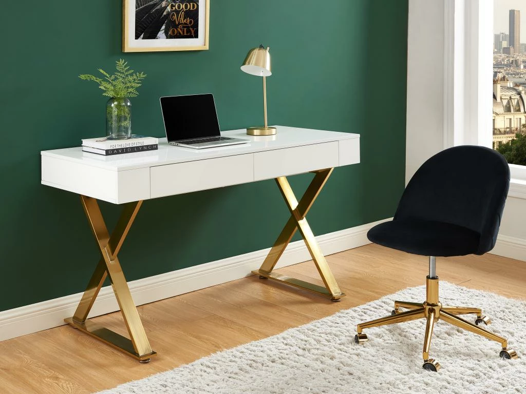 Le bureau PLEISA alliera l’élégance du style art déco et le confort d’un bureau avec rangements intégrés. Doté de 2 tiroirs sous le plateau, vous pourrez ranger tous vos documents et accessoires tout en gardant un espace de travail ordonné et spacieux. Idéal pour travailler et étudier avec style tout au long de la journée !