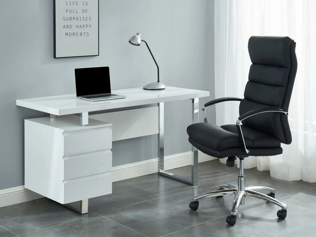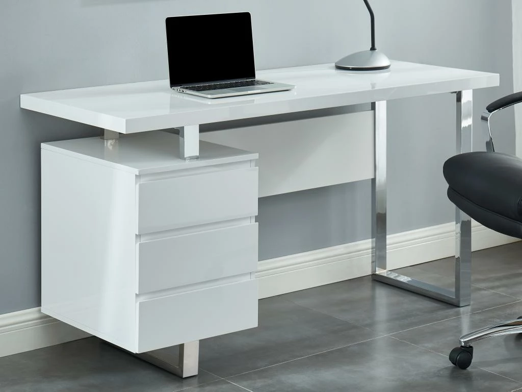 Ce bureau à l’allure design est aussi pratique que moderne. Profitez d’un bel espace de rangement grâce à ces 3 tiroirs qui vous permettront d’organiser simplement votre aire de travail.