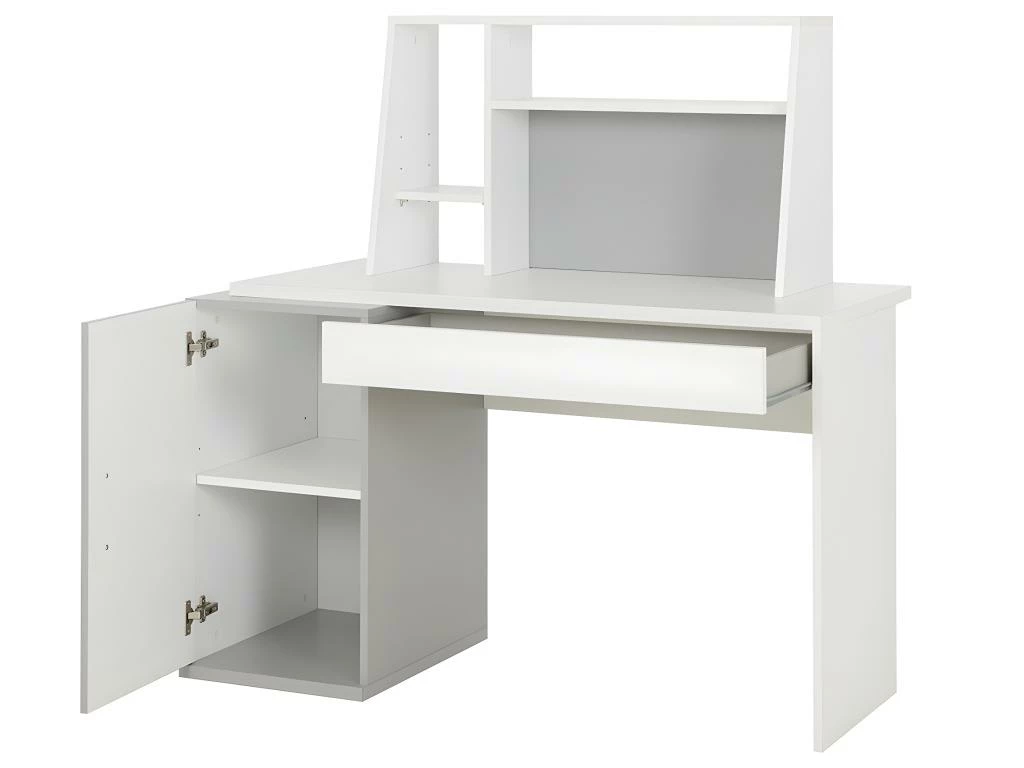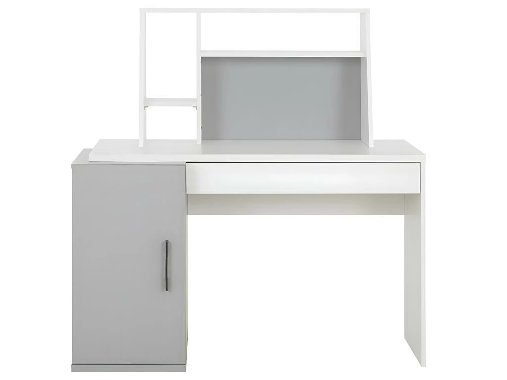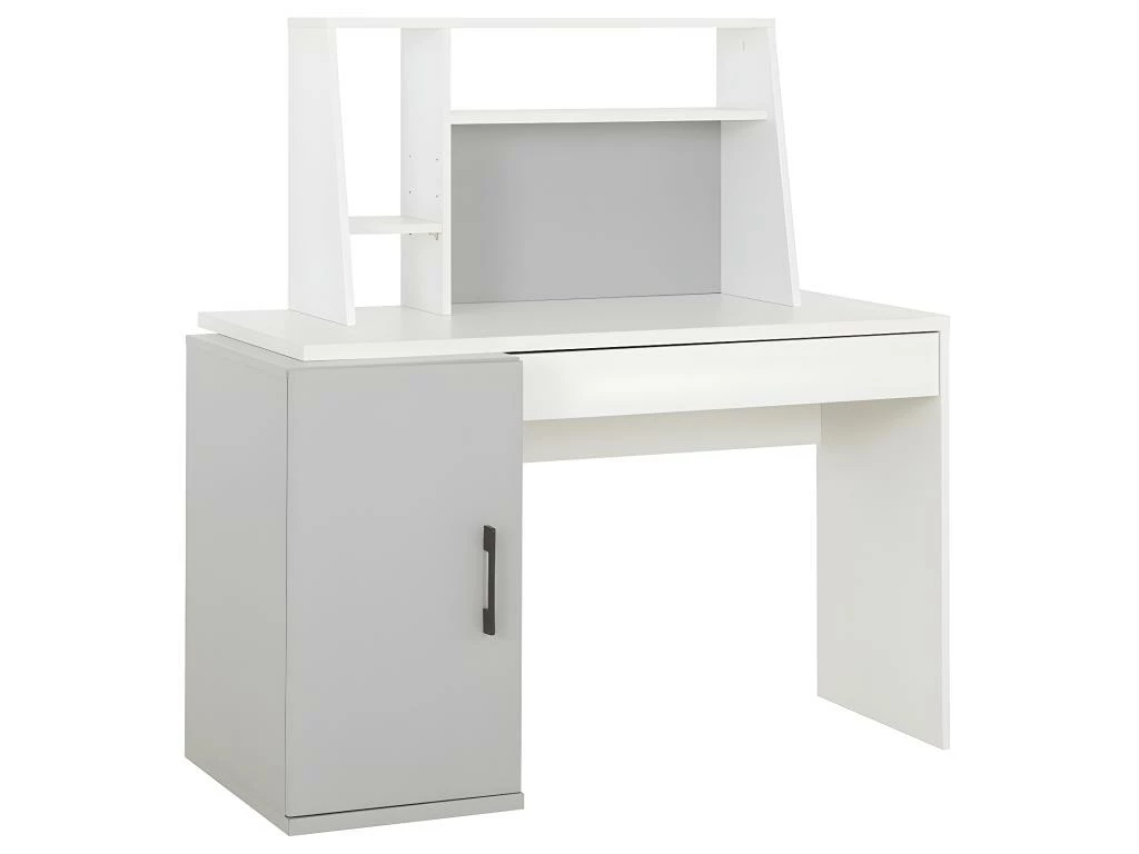 Configuration intérieure : 1 tiroir sous le plateau de travail et 1 compartiment à porte avec deux niveaux de rangements. 1 rehausse de rangement offrant 3 niches de rangements supplémentaires