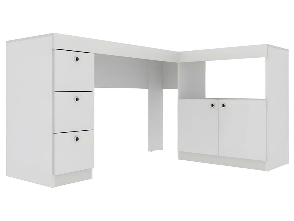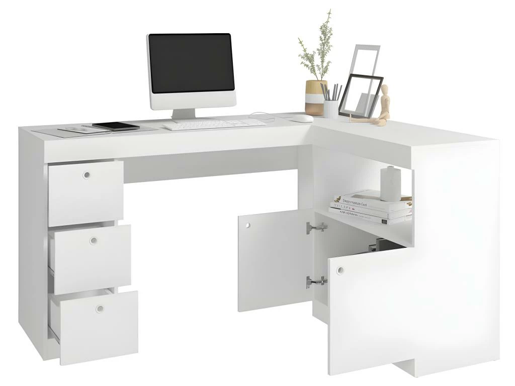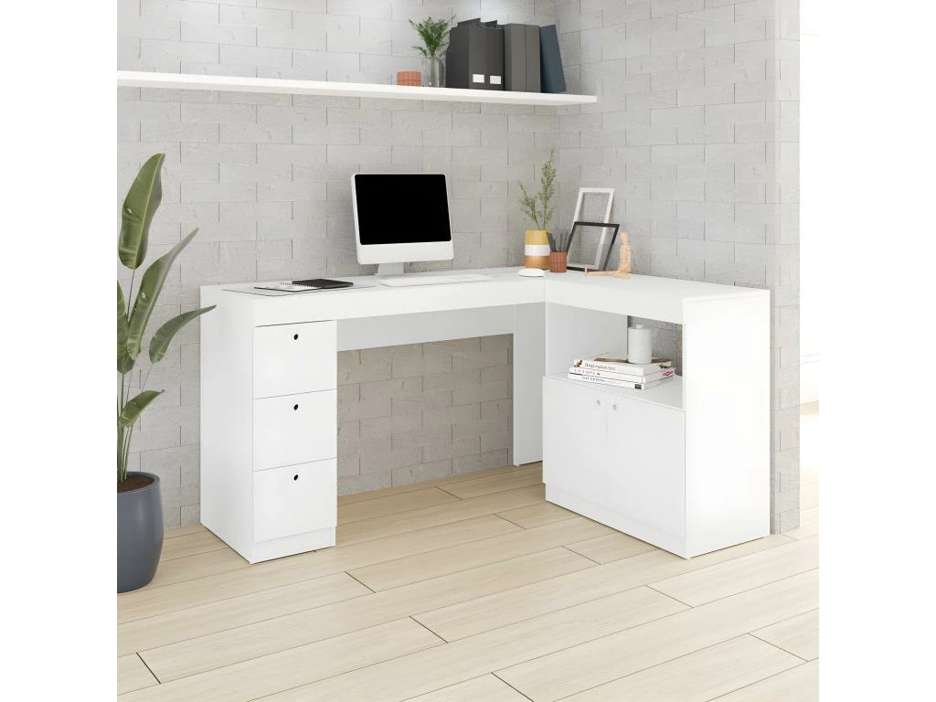 Bureau d’Angle Blanc Caisson 3 Tiroirs et Armoirette 2 Portes IntĂ©grĂ©s OFFICE