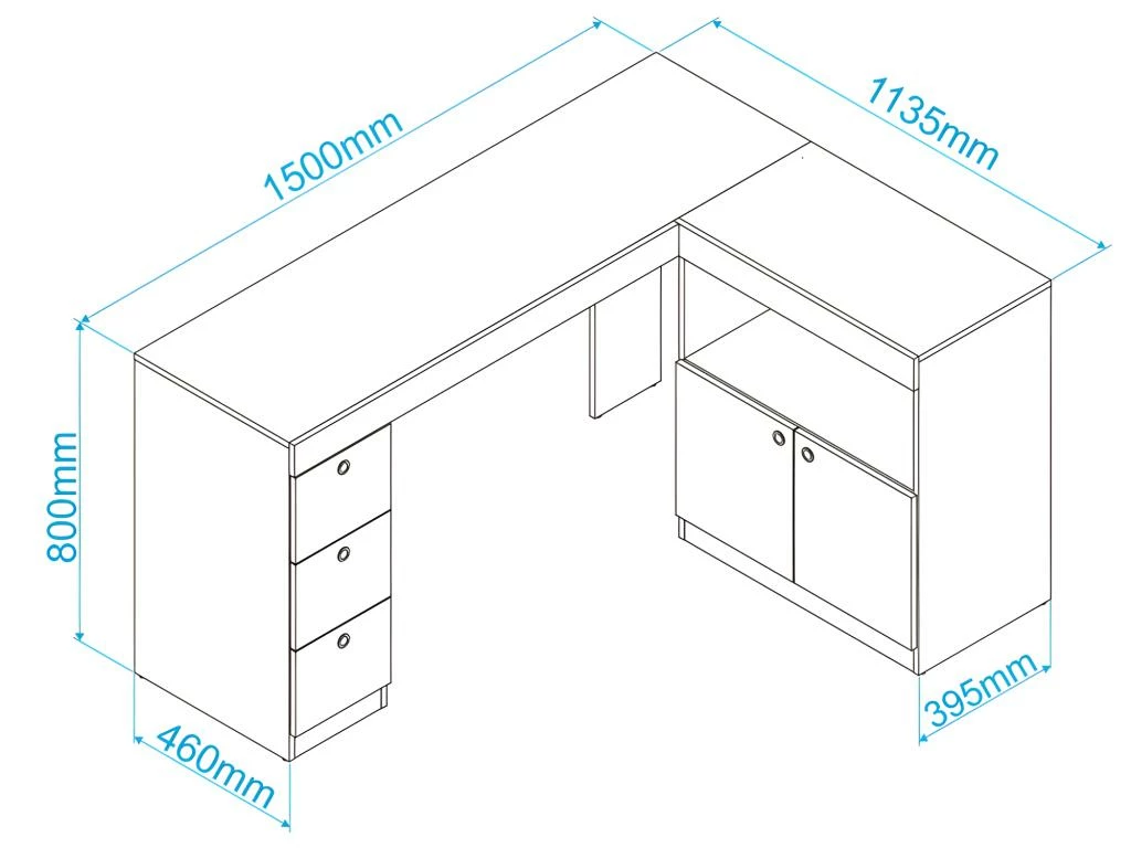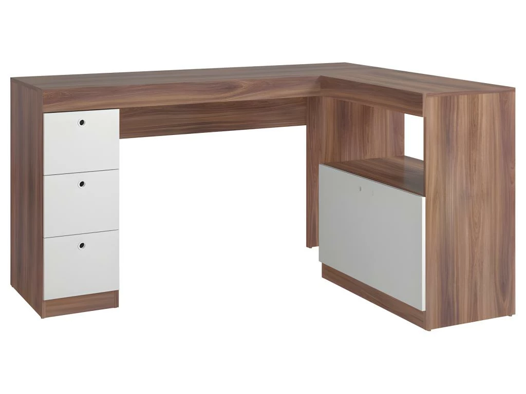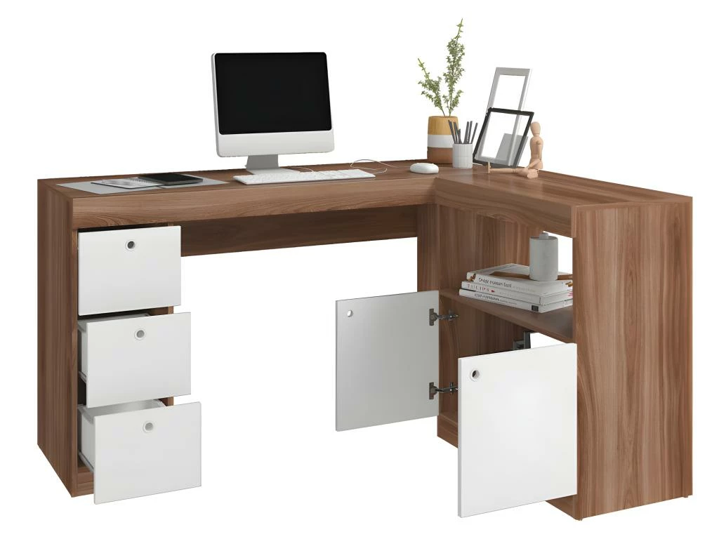 Bureau d’Angle Imitation Châtaignier et Blanc Caisson 3 Tiroirs et Armoirette 2 Portes Intégrés OFFICE