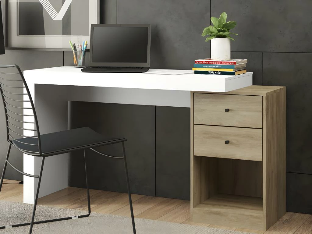 Fonctionnel et moderne, le bureau EVAN se différencie par son côté extensible, son style contemporain et son design destructuré. Grâce à ses deux tiroirs et sa niche, vous pourrez organiser votre espace de travail comme vous le souhaitez.