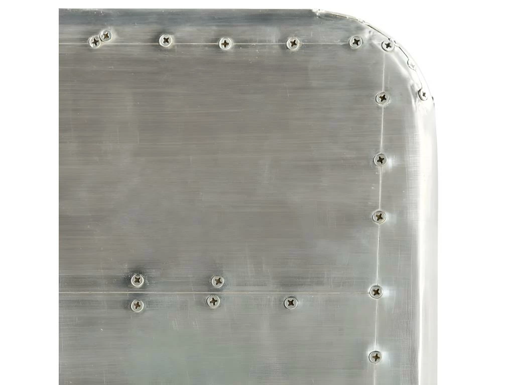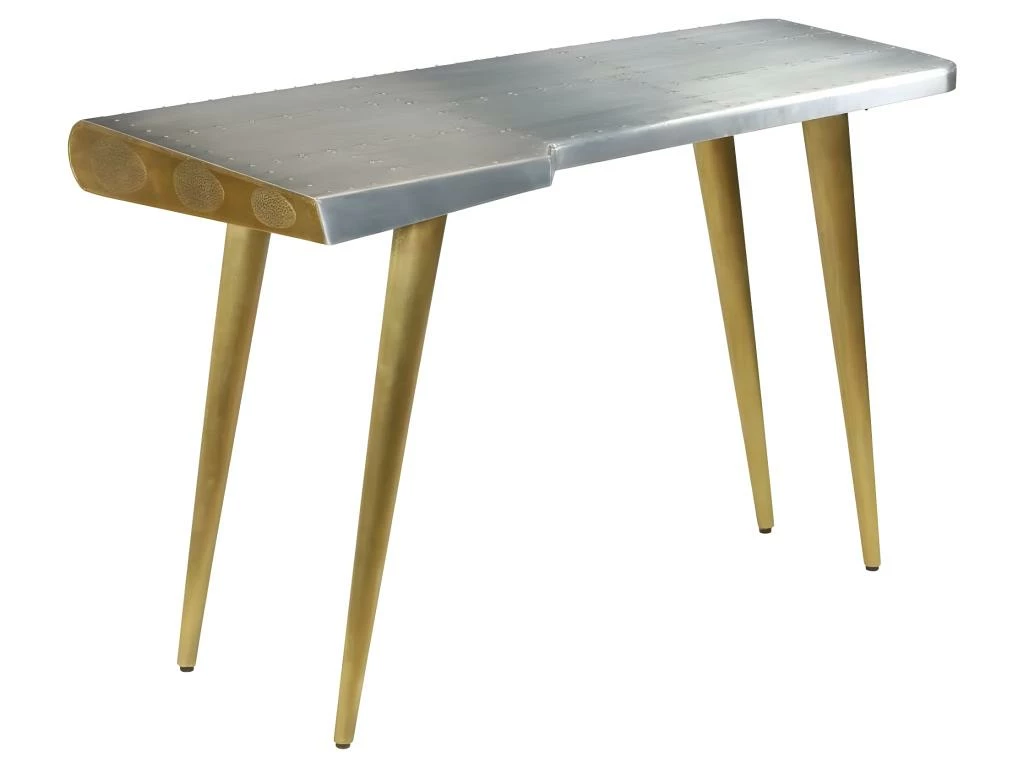 Le bureau de style aéronautique est en bois massif de manguier et sa surface est revêtue d’un patchwork de panneaux en aluminium poli, accentué par les vis en acier apparentes, ce qui le rend extrêmement résistant.