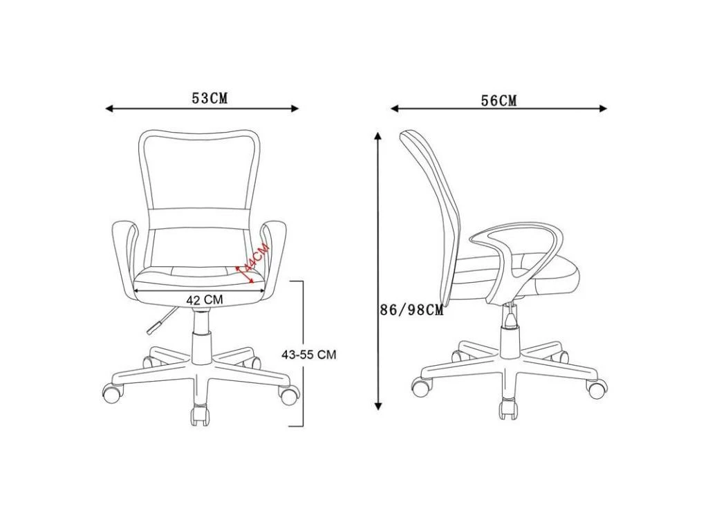 Chaise de bureau rouge et noire à roulettes et accoudoirs