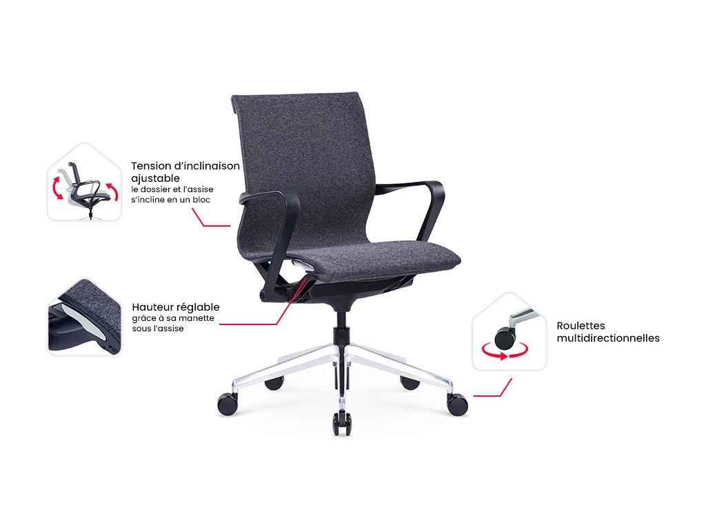 Pivotante, Hauteur ajustable, Maintien lombaire, Avec roulettes