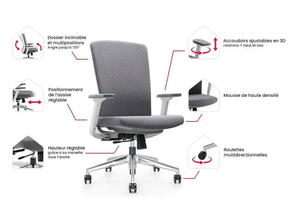 Le fauteuil de bureau doit être adapé et adaptable à son utilisateur et à la situation de travail. En effet, votre position dans votre siège est très importante afin d’éviter toute douleur au niveau du dos et des cervicales.