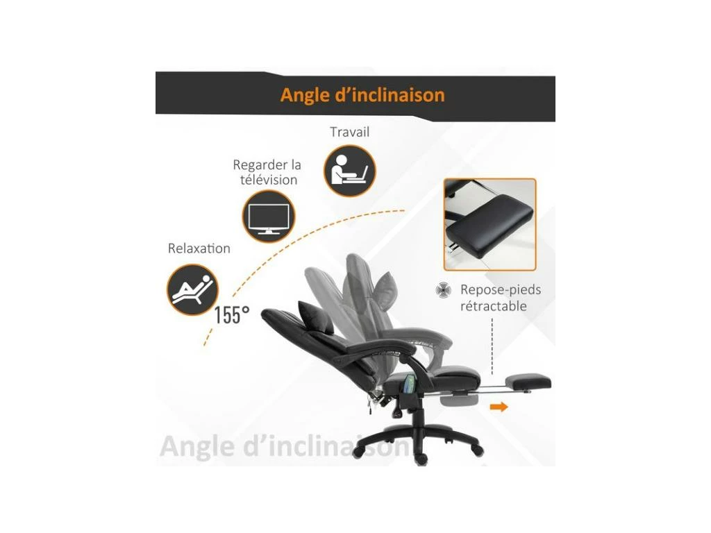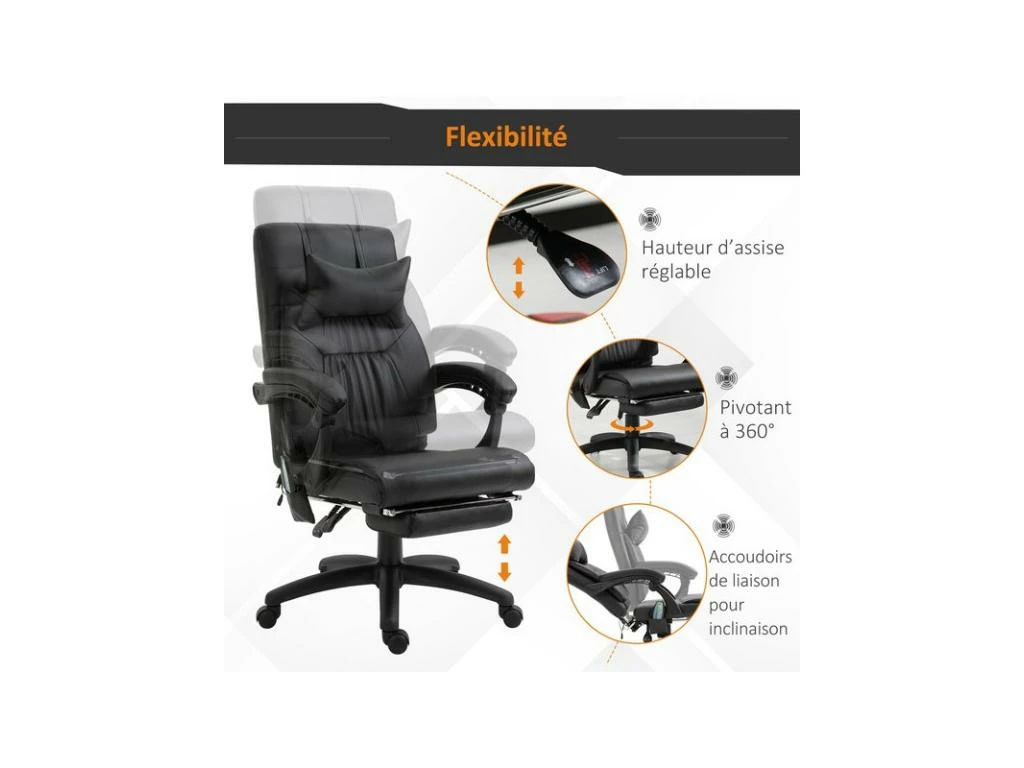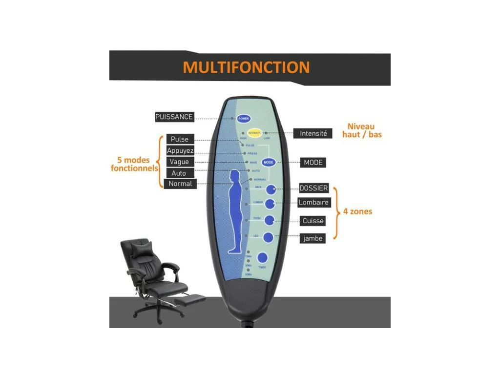 Robuste et massant, le fauteuil de bureau VADOR de MYCOCOONING sert pour le travail et le confort. La hauteur de l’assise et l’inclinaison du dossier rĂ©glables proposent Ă©galement 7 points de massage par vibration pour vous apaiser. Le repose-pieds dĂ©pliable contribue Ă vous permettre d’adopter une position totalement relaxante.
