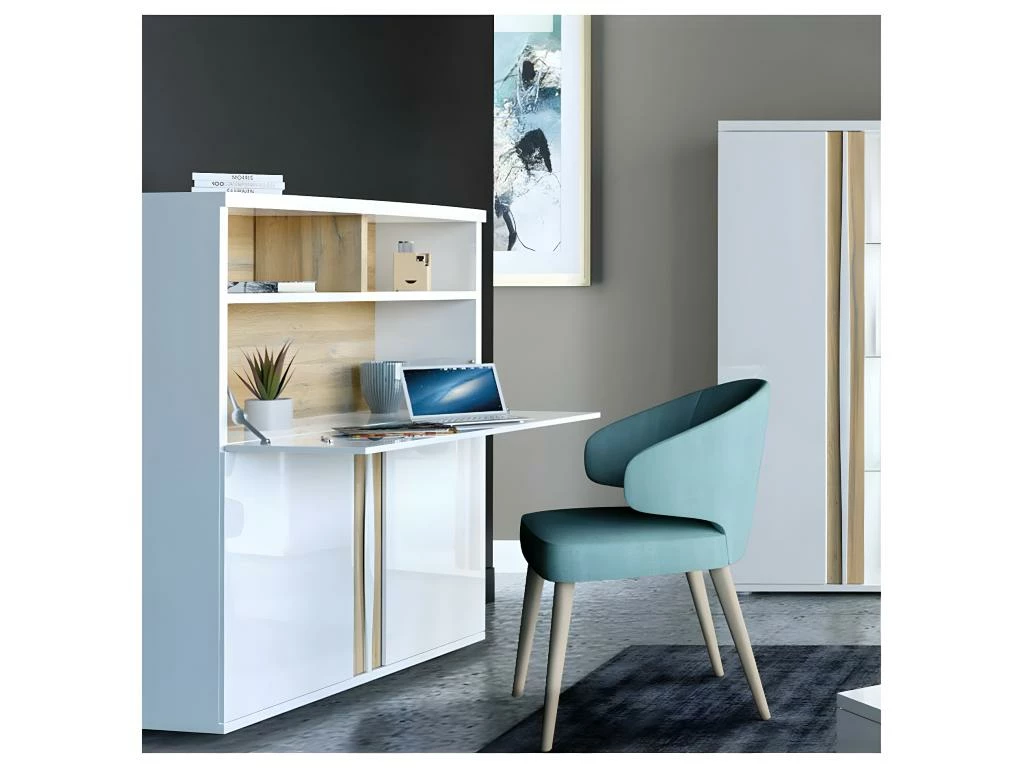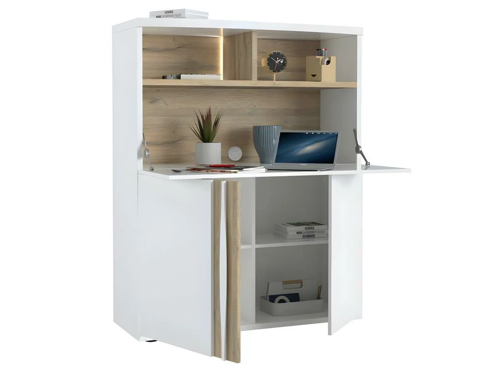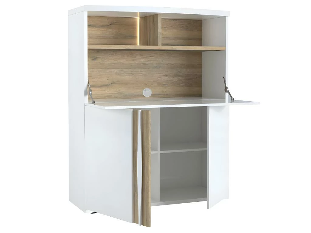 Secrétaire structure en panneaux de particules épais PEFC qui lui assure une bonne solidité, finition laque blanche haute brillance associée au chêne doré texturé et son dessus courbé en 38 mm, ornementé de sa poignée sculptée au design exclusif, aspire à un design modern-basic. Avec ses 2 portes inférieures sur charnière métallique à frein, une niche fermée sur abatant avec compas fonction bureau adapté au télétravail et deux niches supérieures de rangement ouvertes rétroéclairées par un LED diffusant, il offre un volume de rangement considérable (dossiers, imprimante, pc…). Fabrication française, quincaillerie européenne qui font de ce buffet haut un produit de qualité.