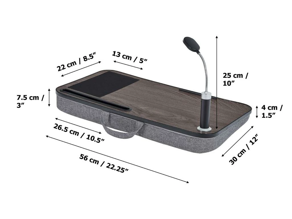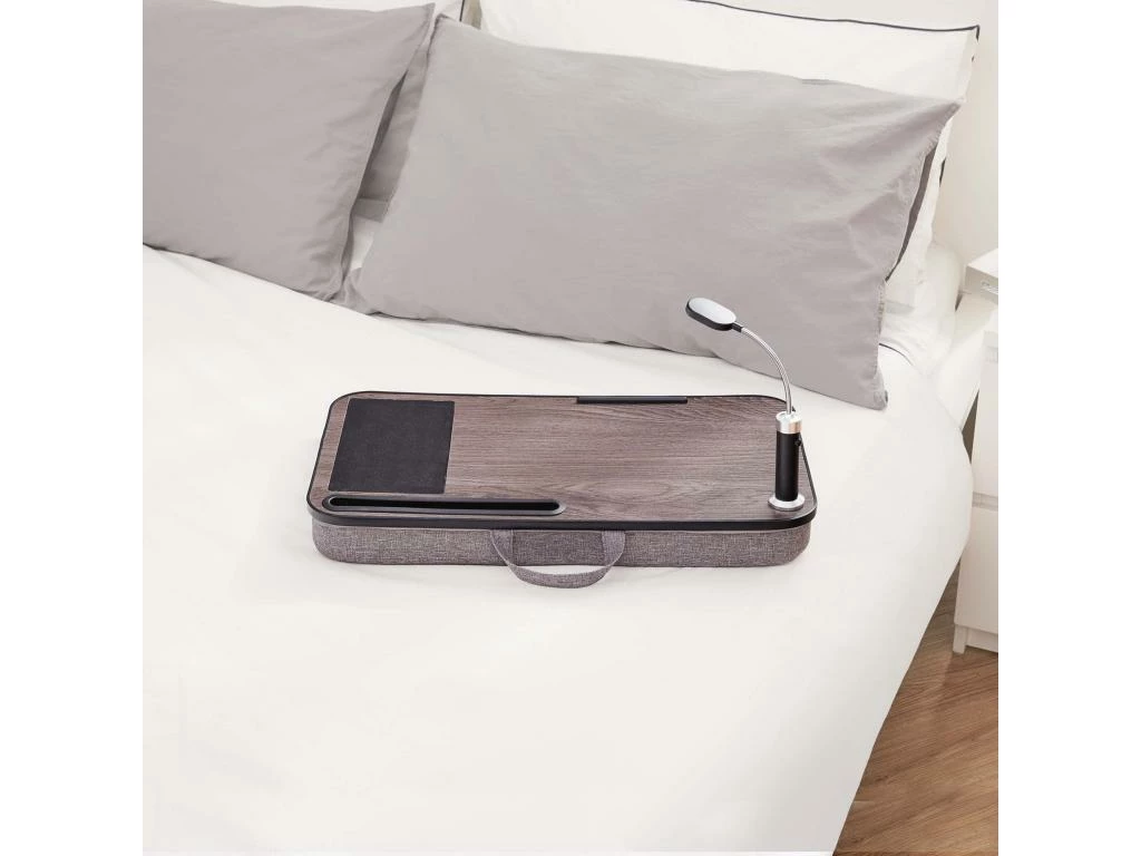 – COMPREND : Le support pc bénéficie d’une plateforme solide en bois et d’un coussin en polyester, une lumière LED (3 x AAA sont nécessaires, pas fournies), un tapis à souris, une petite barre de support pour éviter que les petits objets tombent et une fente pour accueillir tablette ou téléphone portable.